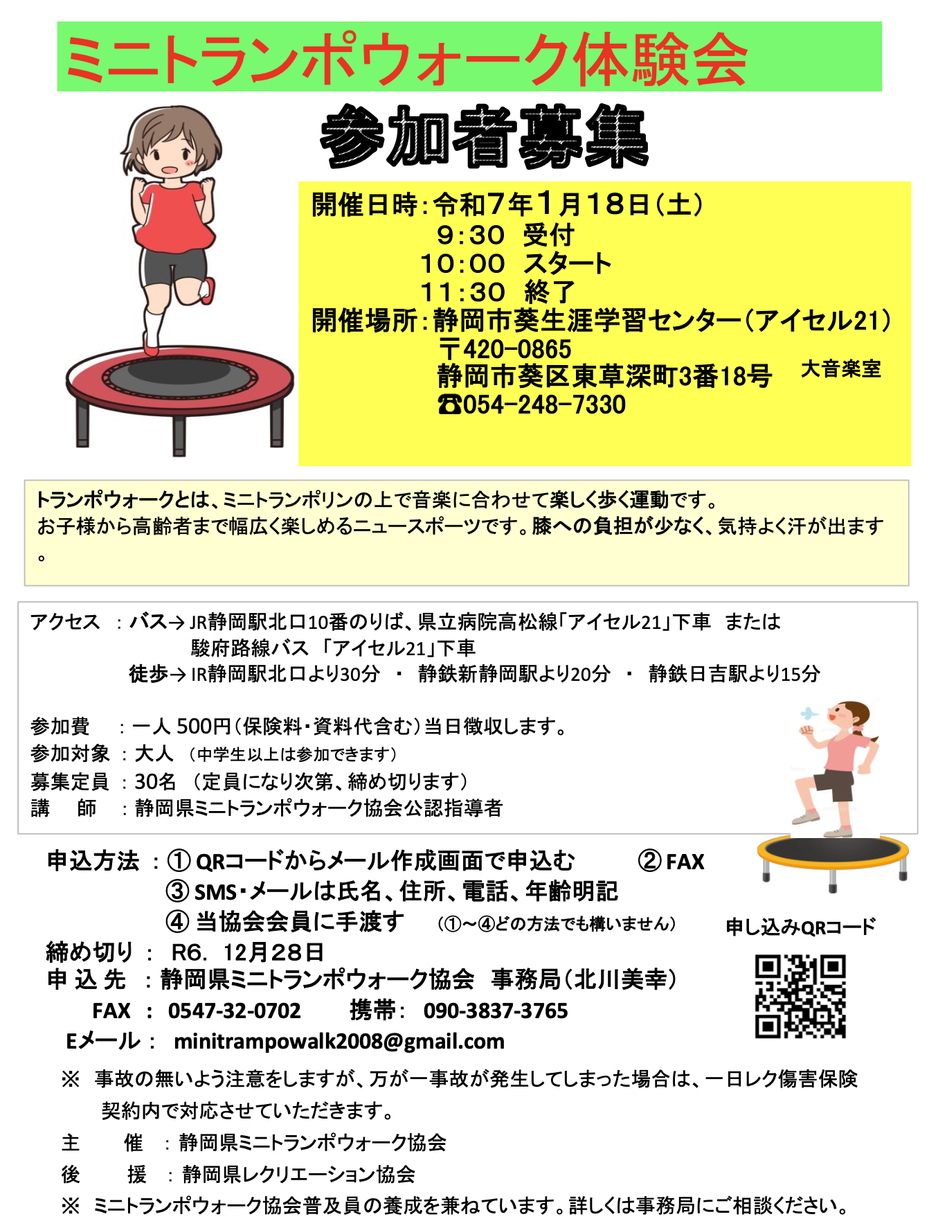 2025年1月18日(土)に静岡市葵生涯学習センター(アイセル21)でミニトランポウォーク体験会を実施します!